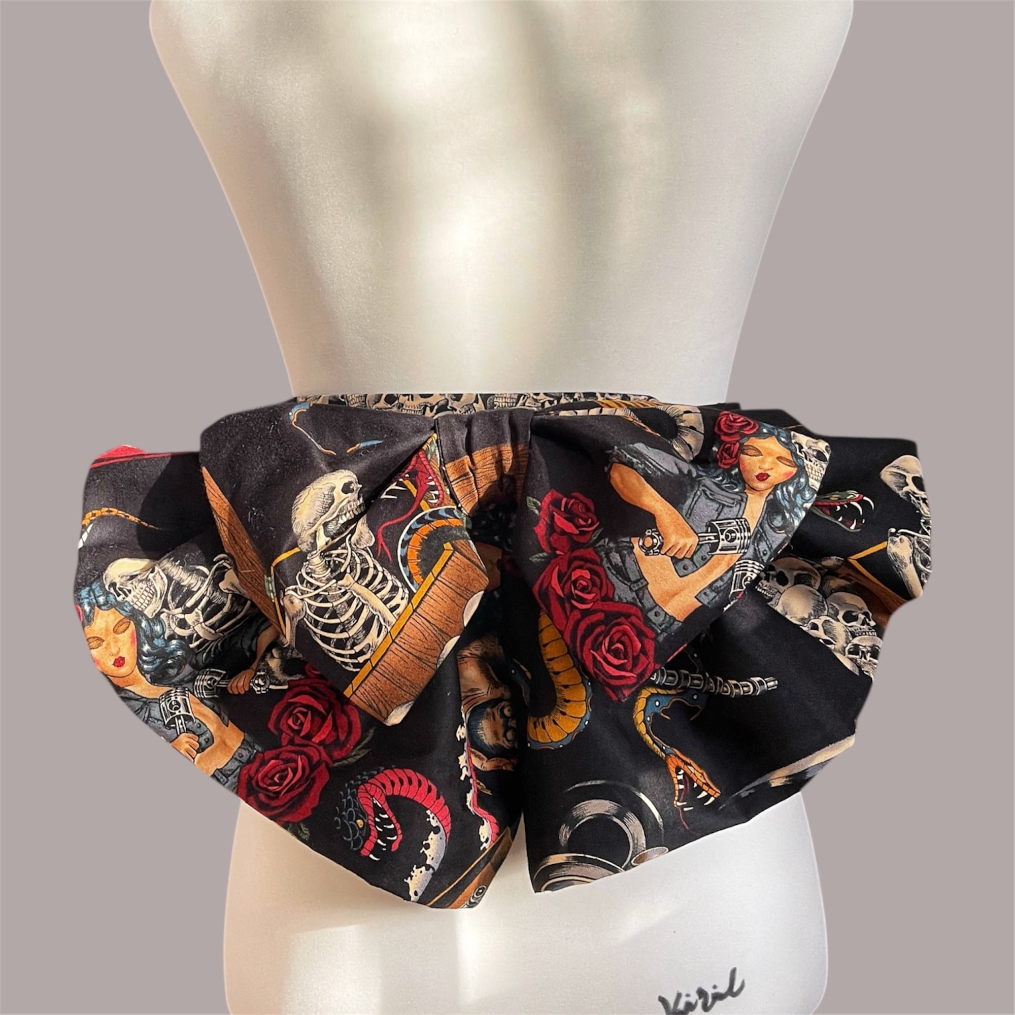 特別芯帯ベルト〈アレキサンダーヘンリー〉 ~~~~~~~~~~~~~~~~~~~~~~~~~~~~~~ 着物をもっと自由に もっとラフに普段着として着物を選ぶ! そんな時代になりつつある中、 切り衣では帯ベルトに注目し 製作をしています。 ~~~~~~~~~~~~~~~~~~~~~~~~~~~~~ アメリカの個性派ブランド、アレキサンダー・ヘンリーデザインのプリント生地、『denim &demon』を使った帯ベルト。 ハードな絵柄がcoolでかっこよく、不思議なことに着物にもしっくりくるおしゃれな帯ベルトに仕上がりました。 色合いは黒でまとまっているので、どんな装いでも合わせれる万能な柄だと思います。他にはないロックな帯ベルト♪ この帯ベルトをつけるだけでハイセンスな着物や浴衣姿に。 柔らかく、でも程よく厚みがあり、しっかりとした特別芯地入りで形が決まりやすく、体にフィット。 ウエスト周りをすっきり見せてくれるのもポイント。細いコードの紐がアクセントとなり、結び目にさりげない個性を演出します。 ▶ 特徴 • 着付け不要!簡単に巻くだけ結ぶだけ! • 軽くて締め心地も快適 • 浴衣・木綿着物・デニム着物との相性抜群 帯ベルトはすべて、手作業で丁寧に仕立てています。 そのため、縫い目の乱れ、多少の傷や歪み、素材の表情が見られる場合もございますが、 それは手仕事ならではの味わいとしてご理解いただければ幸いです。 同じものはひとつとしてない、その出会いをお楽しみください。 ▶ サイズ ・ベルト長さ:約106cm(調整可能) ・幅:約13.7cm ベルトを巻いて、前で紐を結びます。 紐はサイズに合わせてご自分でカットして頂けます。 ●お取り扱いについて 帯ベルトのリボン部分は、あらかじめリボン型に形作られたデザインとなっております。 リボンの形とバランスを保つため、帯に2か所縫い留めておりますので、強く引っ張ったり無理な力を加えたりしますと破損の原因となります。 特に帯ベルトを装着される際は、リボンを強く引っ張りすぎないようご注意くださいませ。 お取り扱いの際は、どうぞやさしくご使用いただければ幸いです。 ●オーダー制作と記載されたものについて サイズをお伺いしてから制作に入ります。 スムーズな制作のため、必要なご連絡はできるだけ3日以内にご返信いただけますようお願いいたします。 ※1週間以上ご連絡がない場合は、制作を一時保留、またはキャンセルとさせていただく場合がございます。 〜最後にお願い〜 すべてのお客様に気持ちよくご利用いただけるよう、スムーズなお取引を心がけております。 一点ずつ丁寧に心を込めて制作しておりますため、ご協力いただけますと大変嬉しいです。