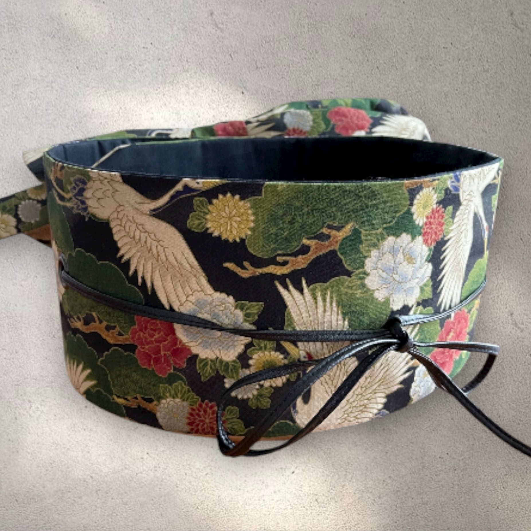 古典柄の鶴と花が描かれたプリント生地を使用した帯ベルトは赤や緑がポイントになった現代的なデザインに仕上がりました。