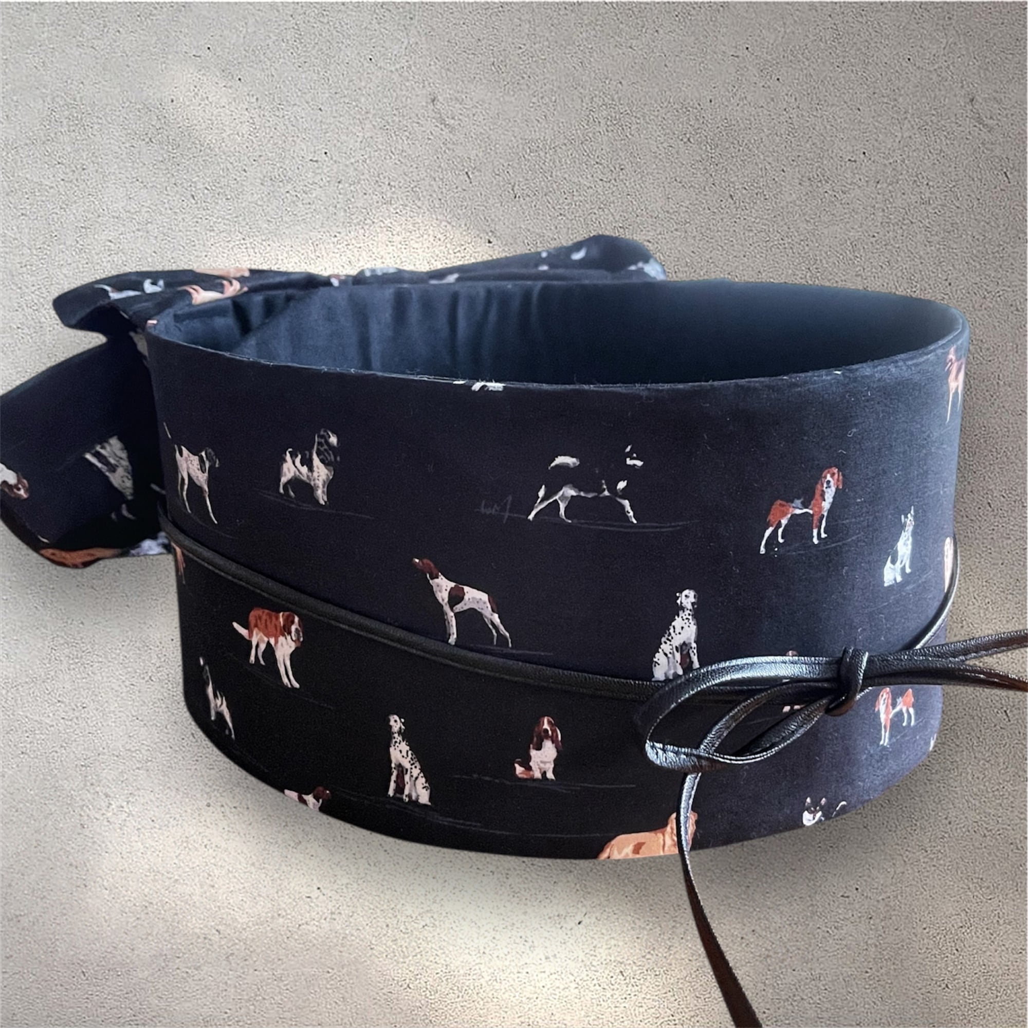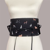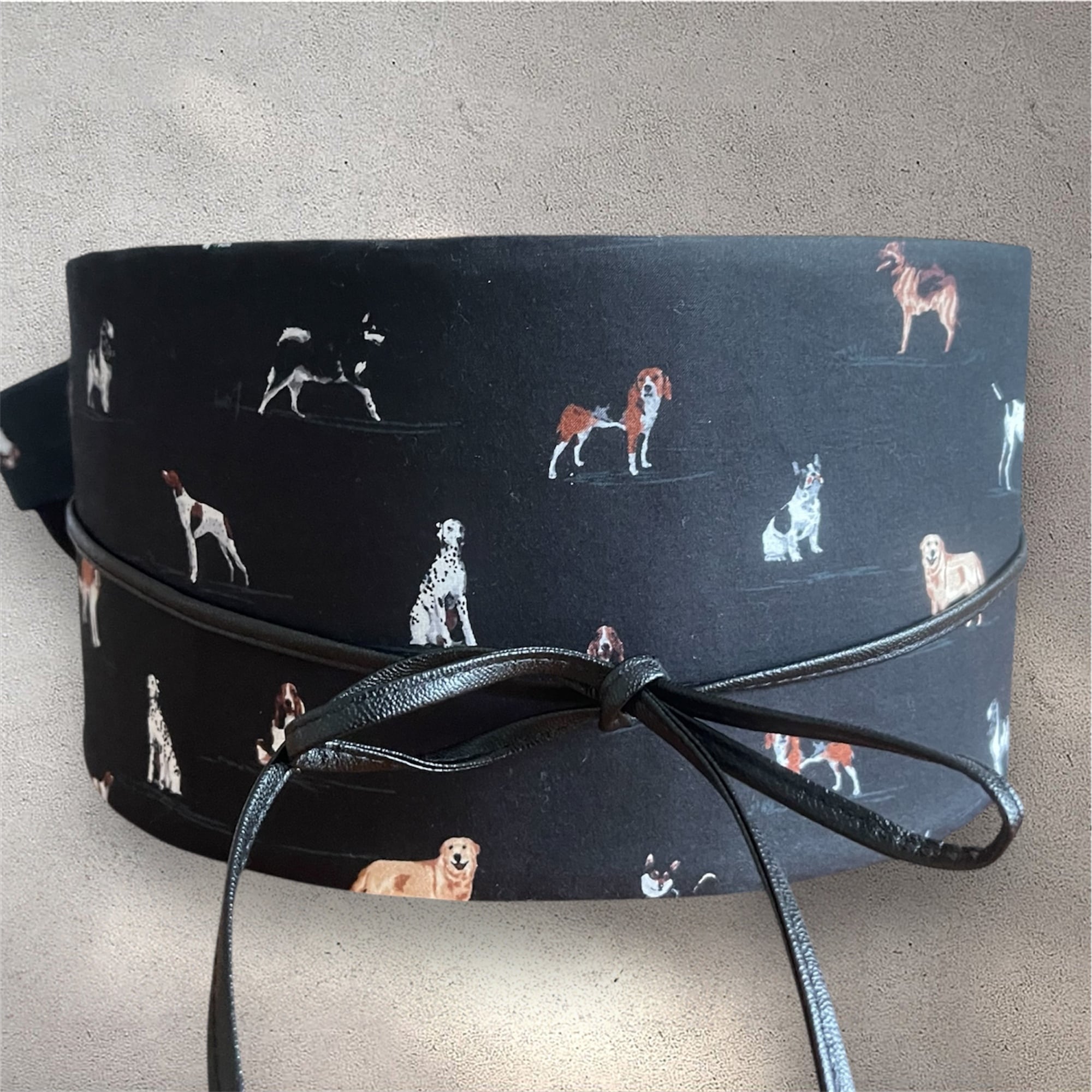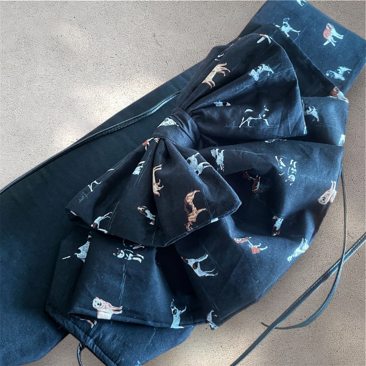 シックなブラック地に、さまざまな犬たちが描かれた遊び心あふれるプリント生地を使用した帯ベルト。