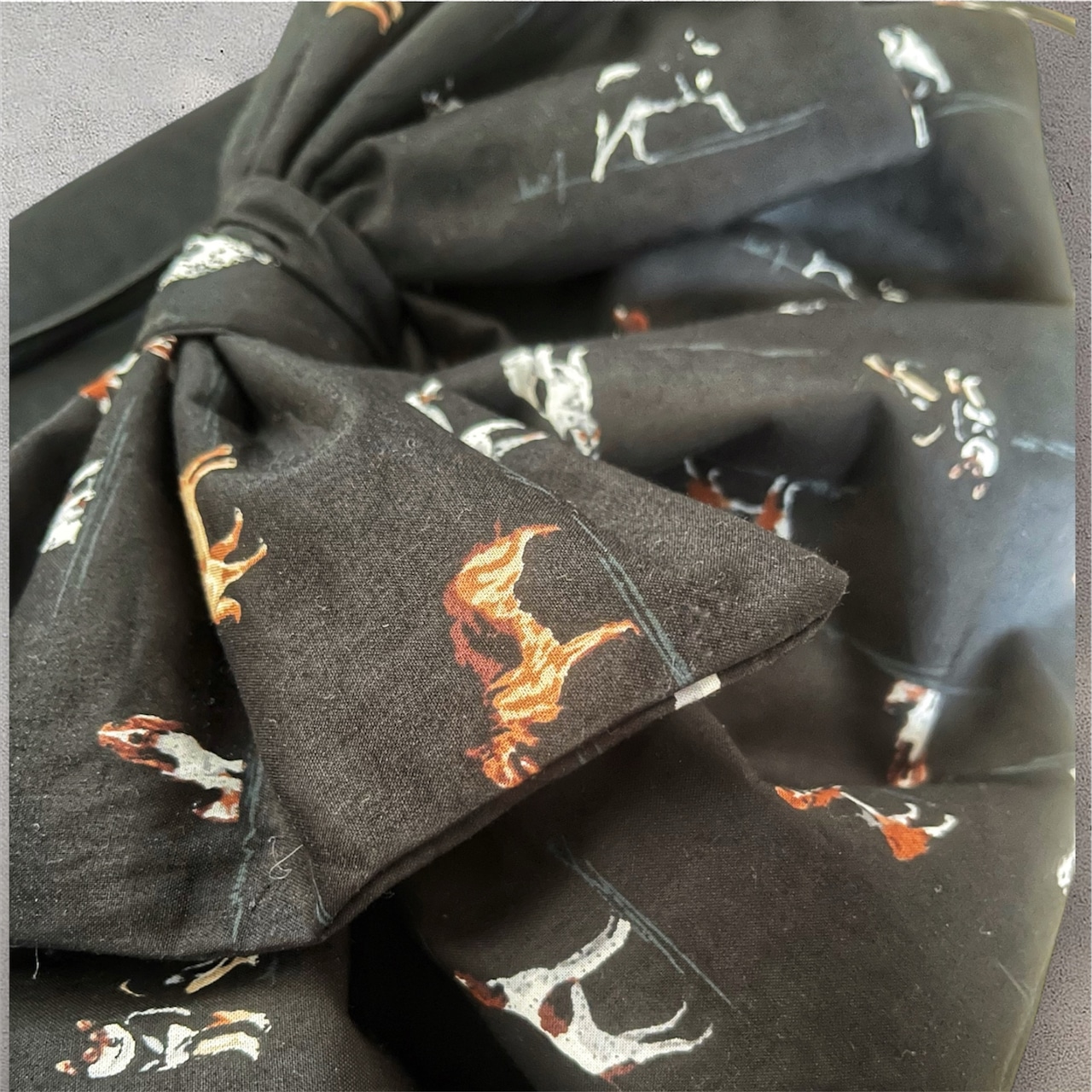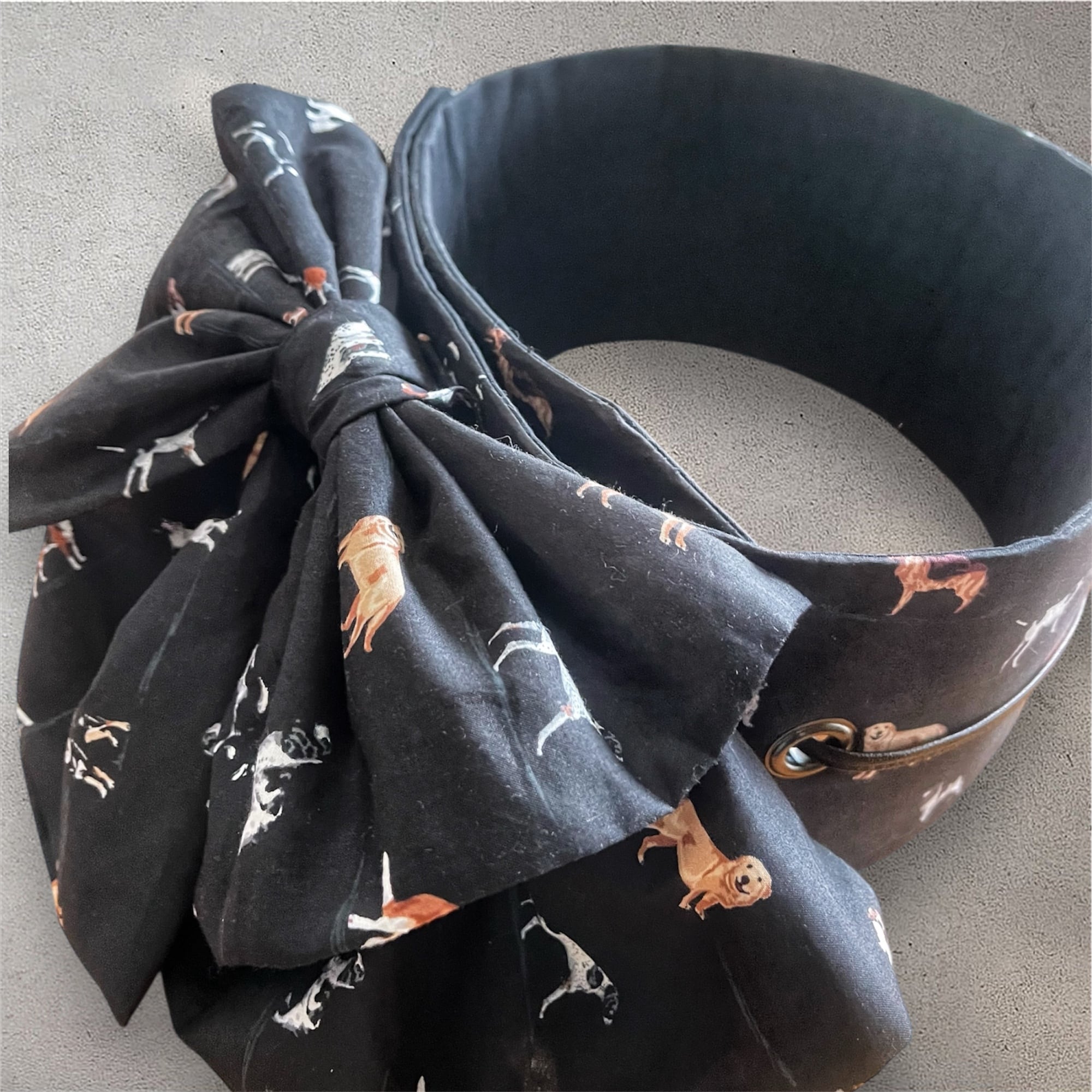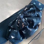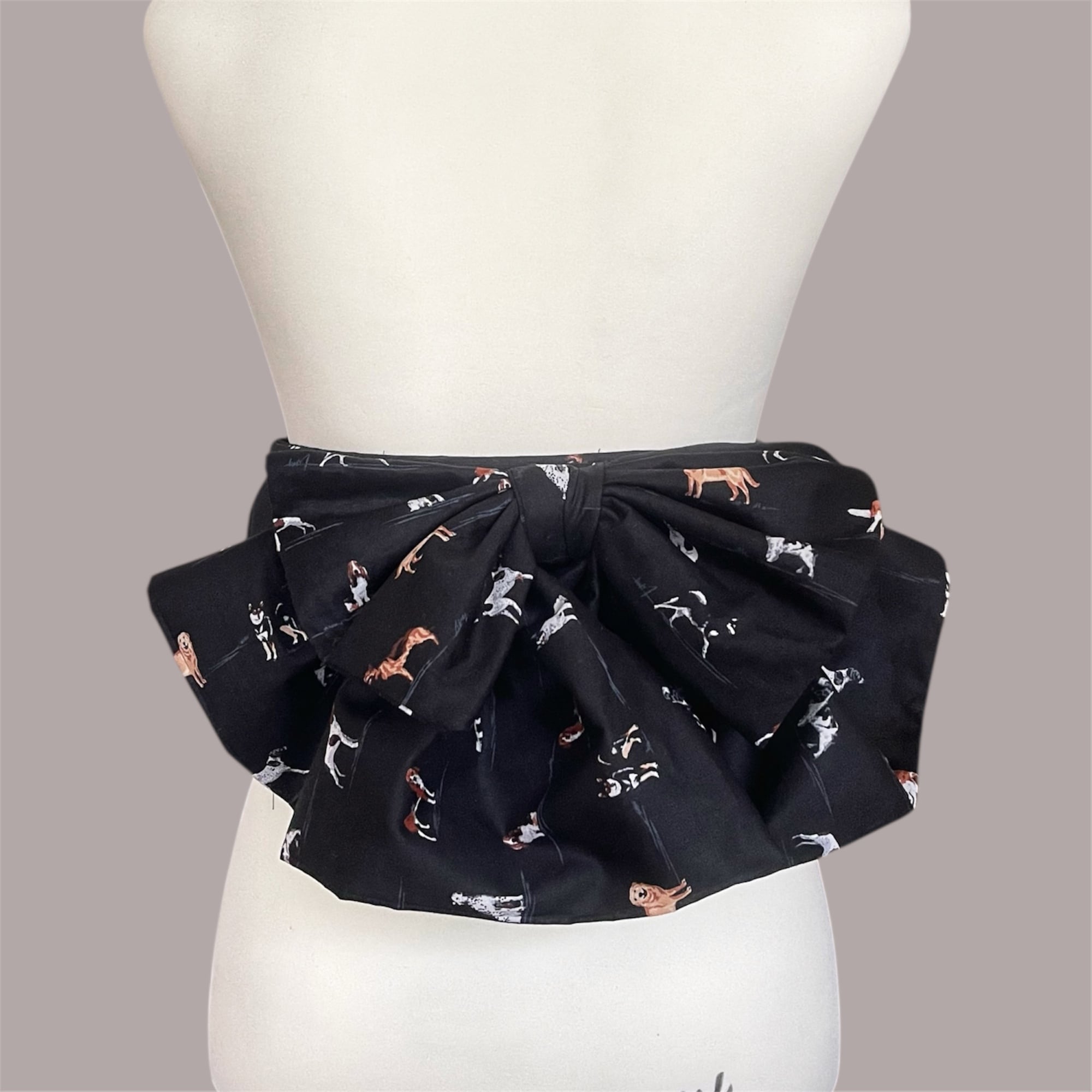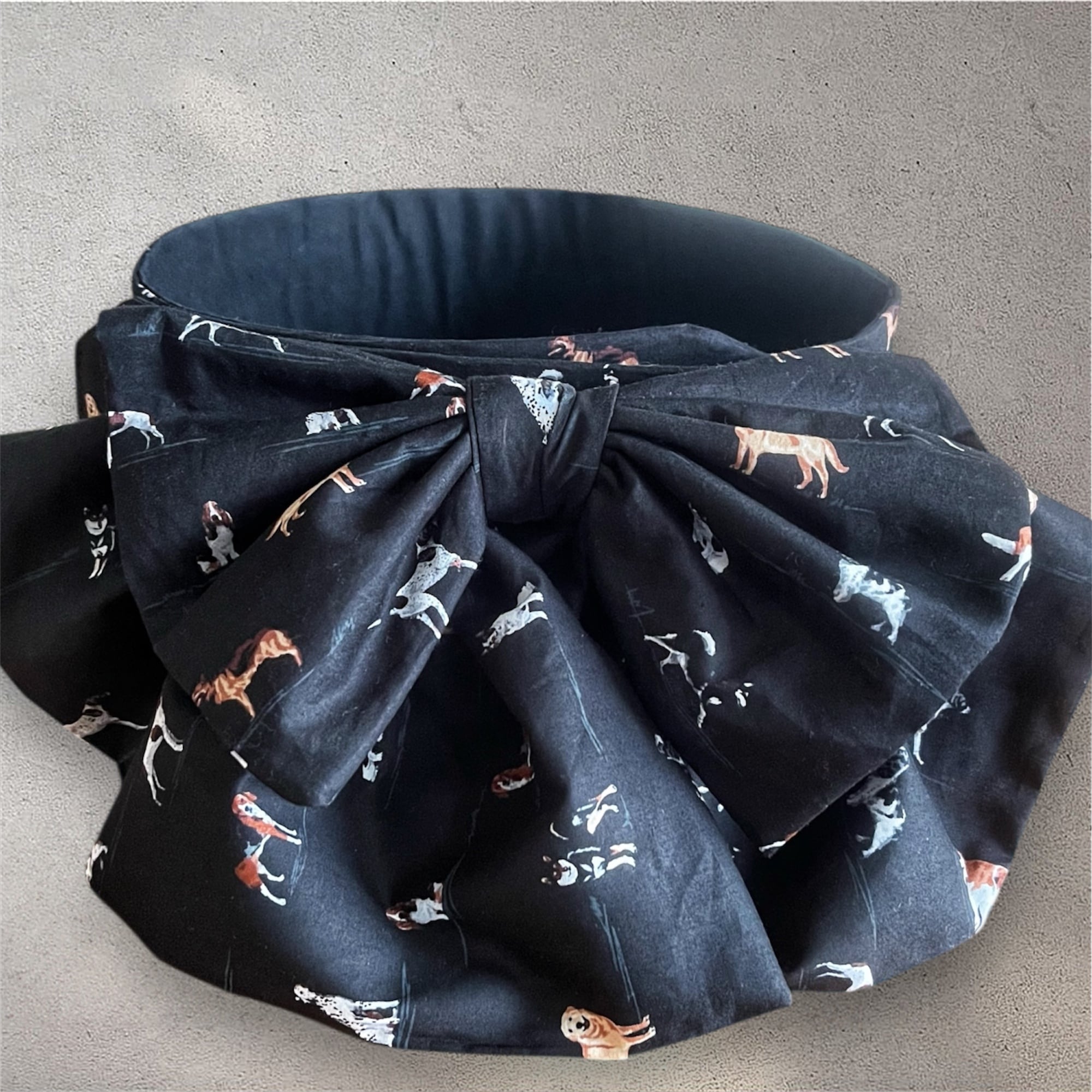 シックなブラック地に、さまざまな犬たちが描かれた遊び心あふれるプリント生地を使用した帯ベルト。