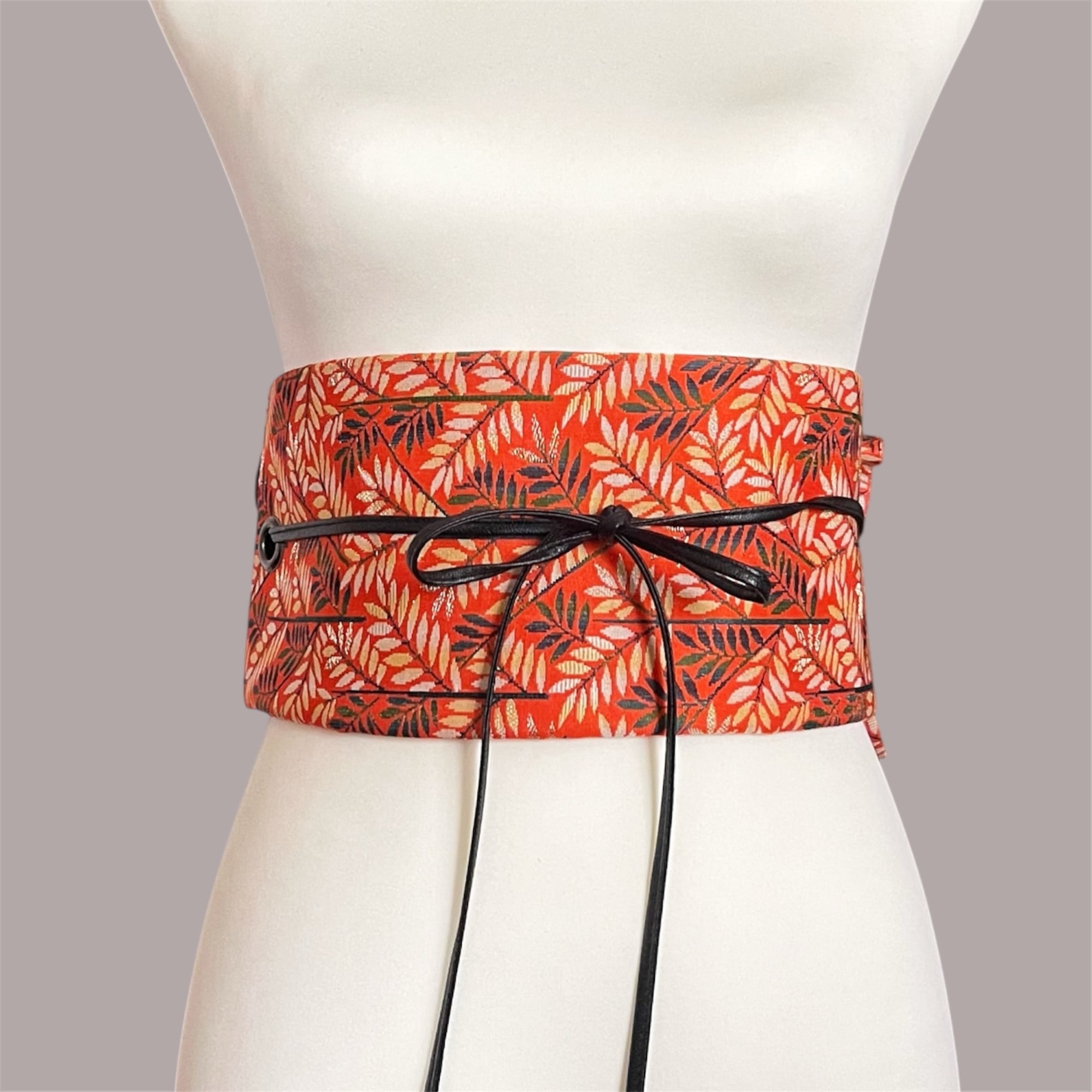鮮やかな朱色を基調に、葉模様が印象的な帯生地を使用した帯ベルト。