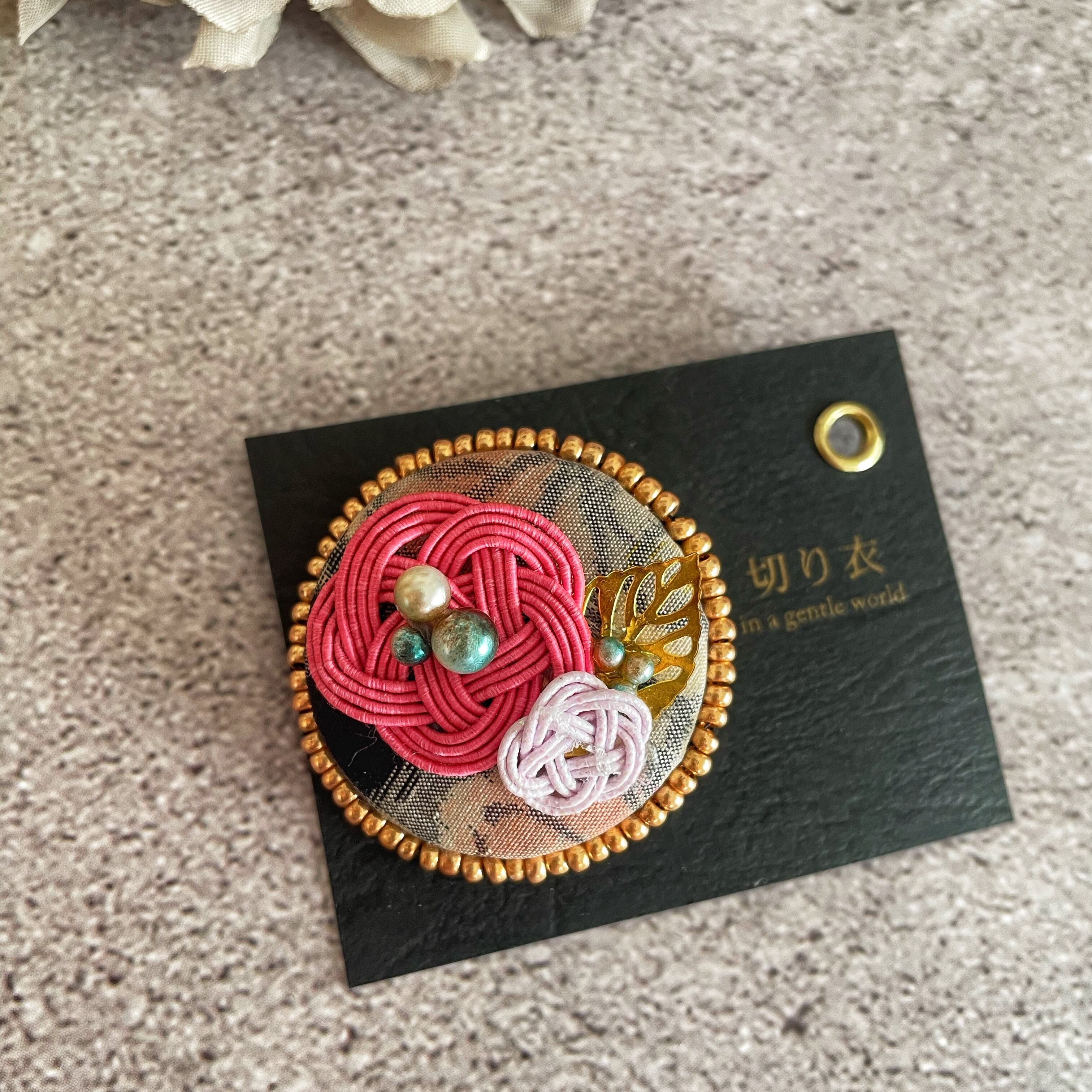 アンティーク着物地と水引で出来たブローチ⭐︎ピンク⭐︎帯留